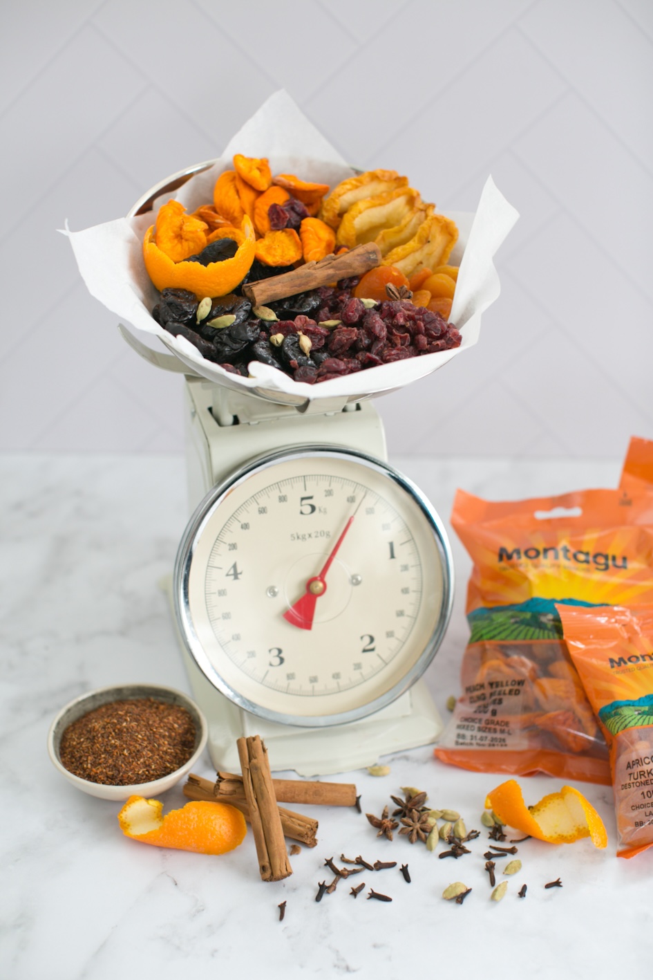 - Add the dried fruit, cinnamon stick, orange peel, star anise, cloves, cardamom pods, vanilla extract and salt to the tea. Bring to a gentle simmer over medium heat.