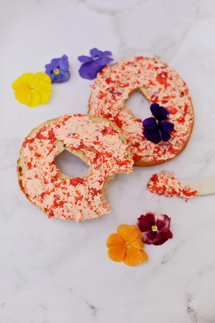 1. Mix & smash your Flora Plant Butter, caster or powdered sugar & the diced strawberries together. Smear on your bagel, add an edible flower or two.